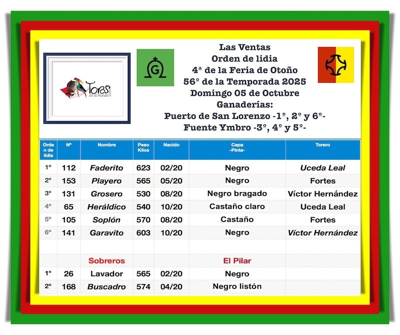 Este será el orden de lidia de los toros de Fuente Ymbro, Puerto de San Lorenzo y La Ventana del Puerto para el 56º festejo de la temporada –4ª de la Feria de Otoño– a celebrarse este domingo 5 de Octubre en la Monumental Plaza de Las Ventas. En el cartel se leen los nombres de Uceda Leal, Fortes y Víctor Hernández. El festejo dará inicio a las 18:00 horas.