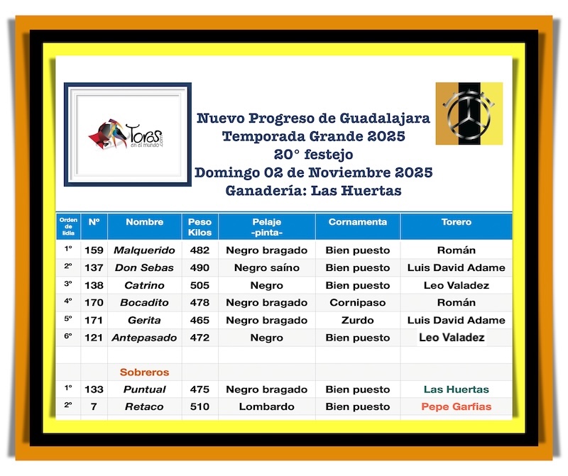 Este es el orden de lidia para los toros de la ganadería de Las Huertas a lidiarse este domingo 02 de Noviembre en el Nuevo Progreso de Guadalajara. En el cartel se leen los nombres de Román -quien sustituye a Borja Jiménez-, Luis David Adame y Leo Valadez. El festejo dará inicio a las 16:30 horas.