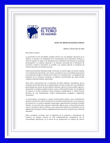 La Asociación El Toro de Madrid, entidad cultural con una dilatada trayectoria en la defensa, el estudio y la divulgación de la tauromaquia como patrimonio histórico y cultural español, se dirige a ese Ministerio para manifestar formalmente su profunda preocupación y su expresa oposición a la iniciativa anunciada por el Ministerio de Juventud e Infancia consistente en prohibir, con carácter general, la asistencia de menores de edad a los festejos taurinos.