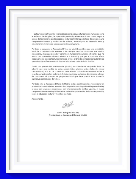 Por todo ello, la Asociación El Toro de Madrid insta a ese Ministerio a reconsiderar en profundidad esta iniciativa, a desistir de cualquier intento de prohibición generalizada y a optar por soluciones respetuosas con el ordenamiento jurídico vigente, el marco competencial establecido y la libertad de las familias para decidir, de forma responsable, sobre la educación cultural y moral de sus hijos.