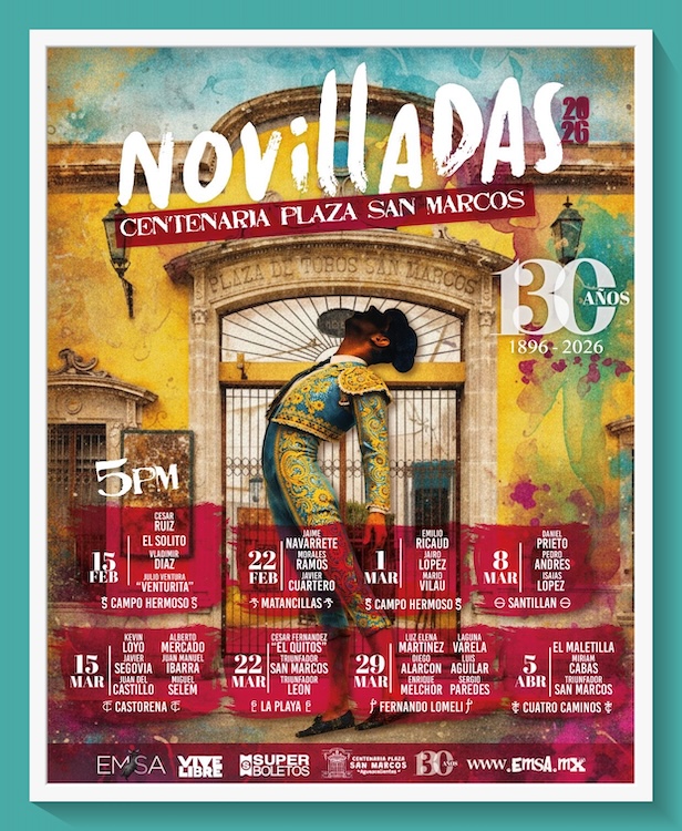 Se anunció oficialmente la Temporada de Novilladas 2026 en Aguascalientes, de la centenaria Plaza San Marcos, la que se llevará a cabo del 15 de febrero al 5 de abril. Un serial dentro de la conmemoración por los 130 años del coso sanmarqueño -1896–2026-. Este año harán el paseíllo 31 novilleros: 27 nacionales y cuatro extranjeros. Los festejos darán inicio a las 17:00 horas.