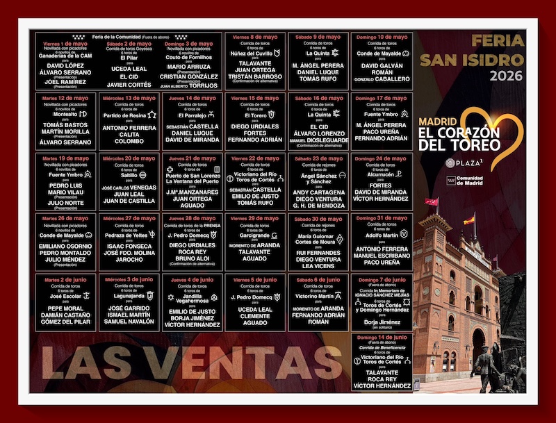 Se ha hecho el anuncio oficial de los carteles tanto de la Feria de la Comunidad, así como de la Feria de San Isidro 2026, la que se llevará a cabo desde el 8 de Mayo hasta el 7 de junio, compuesta por 21 corridas de toros, 3 novilladas y 2 corridas de rejones. Como ya es habitual, los lunes habrá descanso y serán 11, 18, 25 de mayo y 1 de junio. Los festejos darán inicio a las 19:00 horas.